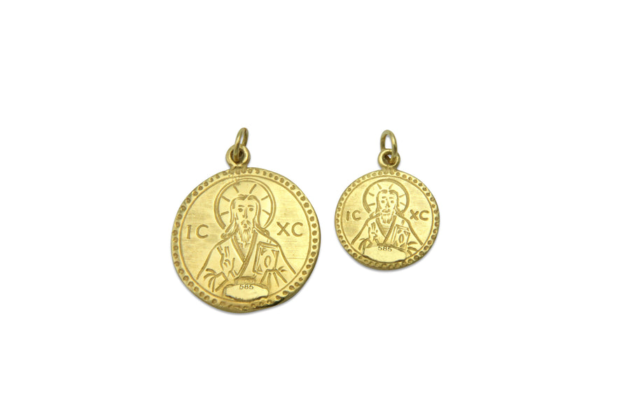 The back of this pendant showcases a lovingly hand-etched Christ holding the gospels in his left hand and the right hand giving a blessing. The letters "IC" stand for the first and last letters of the word Ιησους (Jesus) and the letters "XC" stand for the first and last letters of the word Χριστος (Christ).